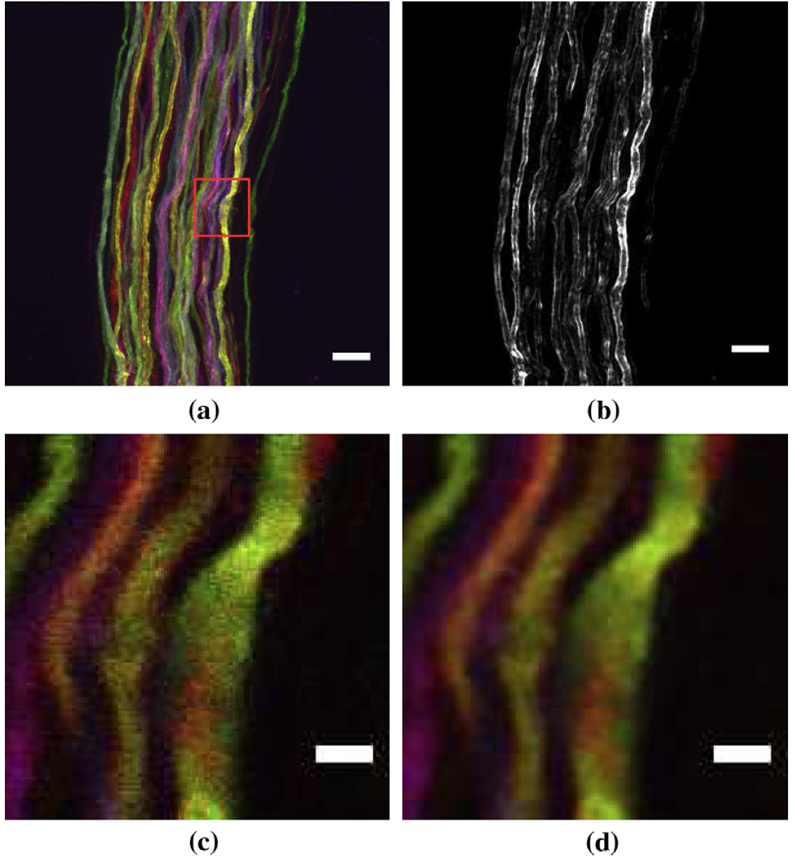 (a) Imágenes de Brainbow que muestran un haz de axones de neuronas motoras. (b) Mapa de bordes estimado de la pila de imágenes. (c) Vista ampliada de un solo corte de la región representada por un recuadro rojo en (a). (d) Misma región después de la eliminación de ruido bilateral 3D. Imagen obtenida de Bas et al. (2012)