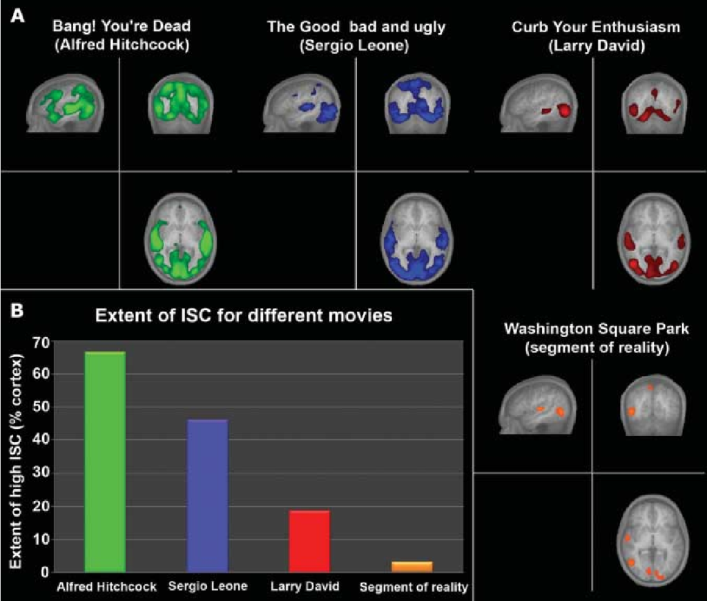 Utilizando RM, un estudio presentó 30 minutos de la película The Good, the Bad and the Ugly (1966) a una serie de voluntarios mientras eran escaneados. La actividad cerebral fue similar en todos los participantes. Hubo una alta activación de la región occipital y temporal, áreas auditivas en la circunvolución de Heschl, regiones cercanas al surco lateral, así como aquellas implicadas en la emoción y, finalmente, las áreas multisensoriales en el lóbulo temporal y parietal.