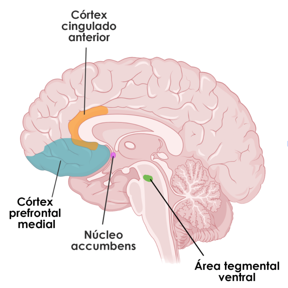 Las áreas cerebrales encargadas de realizar tal tarea son el córtex prefrontal medial, corteza cingulada anterior, núcleo accumbens, vía mesolímbica y área tegmental ventral (Bermejo et al., 2011).