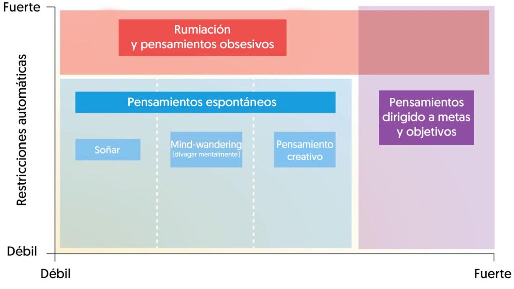 Estos pueden ser espontáneos (no controlados ni dirigidos, y no son iniciados de forma deliberada en un proceso top down), o intencionalmente dirigidos. Pero también, los pensamientos autogenerados pueden estar automáticamente restringidos por factores bottom-up, como la saliencia afectiva. A su vez, abarcan formas de cognición de restricción deliberada, como soñar despierto, vagabundeo mental y pensar de manera creativa.