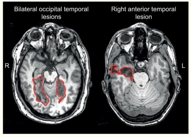 De manera concreta, la circunvolución occipitotemporal del hemisferio derecho. De hecho, estudios recientes muestran que, dependiendo de la localización cerebral de la lesión, se manifestará un tipo de prosopagnosia. Para la prosopagnosia aperceptiva se muestran lesiones en lóbulos temporales occipitales bilaterales (parte izquierda en la imagen). Por otra parte, la prosopagnosia asociativa ocurre por lesiones temporales anteriores (parte derecha en la imagen).