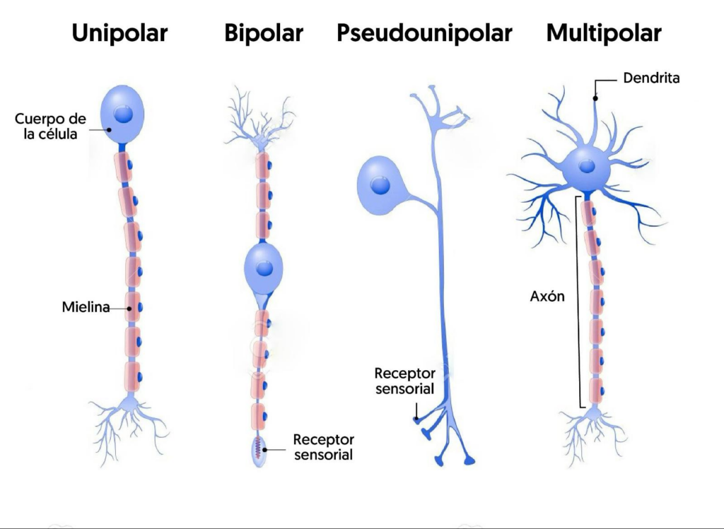 A continuación, examinaremos cuáles son las principales categorías de neuronas. Las diferenciaremos según su morfología y polaridad, destacando sus características distintivas: